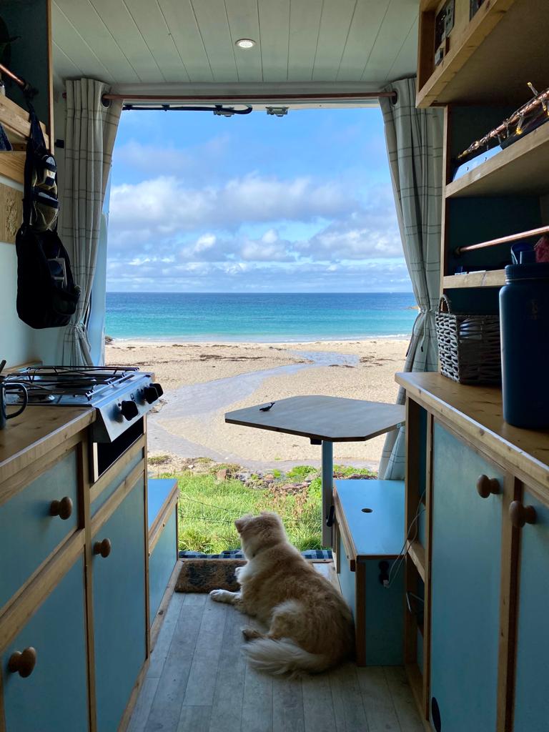 We continued our drive the next day, stopping at a peaceful beach for lunchtime and taking a seaside stroll with Cookie.